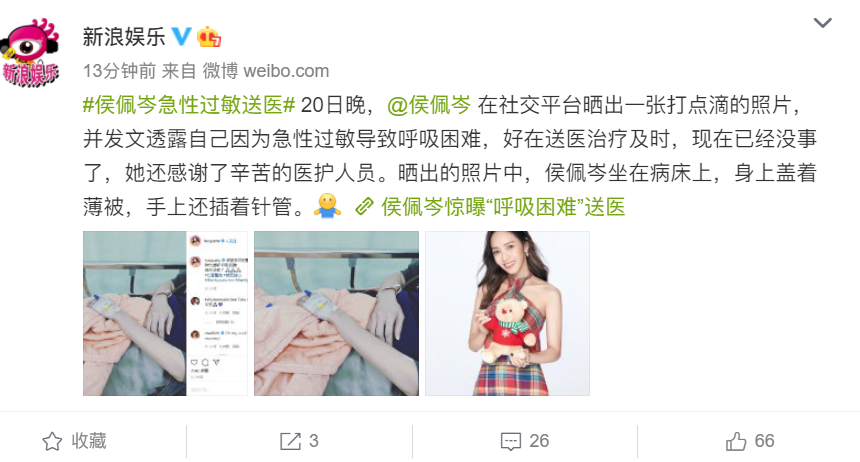 就在昨天,侯佩岑就因为急性过敏,导致呼吸困难被送进了医院!