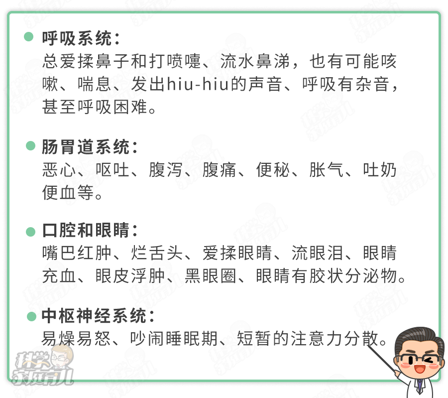 除了这些在皮肤上的表现外,过敏也同样可以引起宝宝身体其他部位的反应!